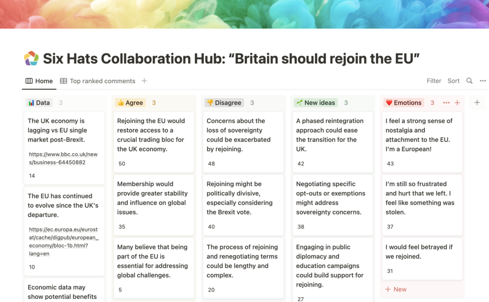 The Six Hats Collaboration Hub builds on the "Six Thinking Hats" meeting methodology created by Edward de Bono, and adds the power of online collaboration and social voting.